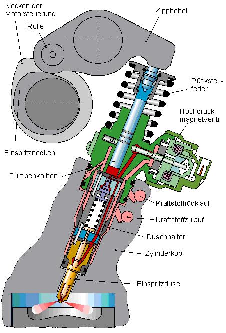 Der Druck der für die Einspritzung notwendig ist, wird bei diesem Verfahren für jeden Zylinder durch die Nockenwelle, die direkt an den Pumpedüseelementen sitzt, erzeugt. Wie der Name schon sagt sind Pumpe und Düse in einem Element verbaut. Der Druck wird dort erzeugt wo er auch gebraucht wird. Die Hochdruckleitung fällt in diesem Fall weg. Teilweise wird die Einspritzung elektronisch gesteuert.