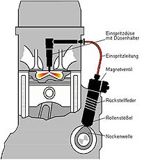 Die Commonrail-Einspritzung wurde schon vor langer Zeit erfunden, jedoch erst in den letzten Jahren eingesetzt. Eine Pumpe erzeugt in der gemeinsamen Kraftstoffleitung den hohen Druck. Von der gemeinsamen Kraftstoffleitung aus wird der Kraftstoff dann elektronisch jedem Zylinder über einen Injektor zugeteilt. Die überschüssige Menge läuft zurück in den Kraftstofftank. Vorteil dieses Systems ist, dass nur eine Hochdruckpumpe nötig ist. |